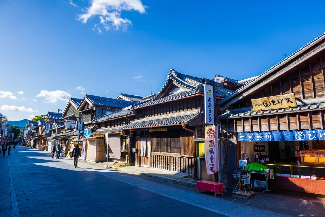 Breakfast at the hotel, then depart for a visit to the Geku Shrine, dedicated to the goddess Toyouke, the protector of food and dwellings. Next, you will explore Okage Yokocho, a district created to celebrate gratitude. This place invites visitors to wander through its lively streets, lined with small shops and traditional restaurants. Lunch at a local restaurant, followed by a walk around Meoto Iwa, the famous sacred rocks connected by a shimenawa (a sacred braided rice straw rope marking a holy site in the Shinto tradition).